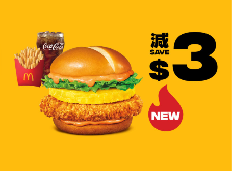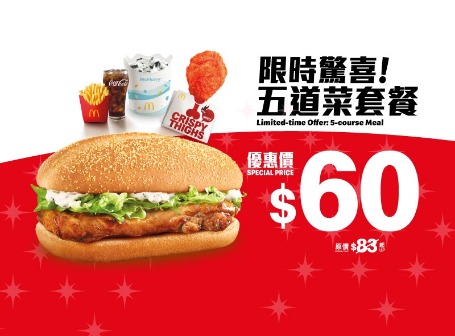 -可選 : 魚柳飽、麥香雞、脆香雞翼(2件) 、麥樂雞(4件) 、原味麥炸雞(1件) 、蜜糖BBQ麥炸雞(1件) 、士多啤梨新地、朱古力新地、蘋果批配指定飲品