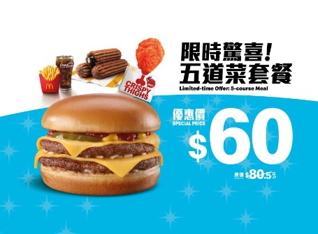 【限時驚喜】$60 雙層芝士孖堡五道菜套餐配麥炸雞(原味/蜜糖BBQ/辣味)1件 及 朱古力肉桂迷你脆條 [可重用]